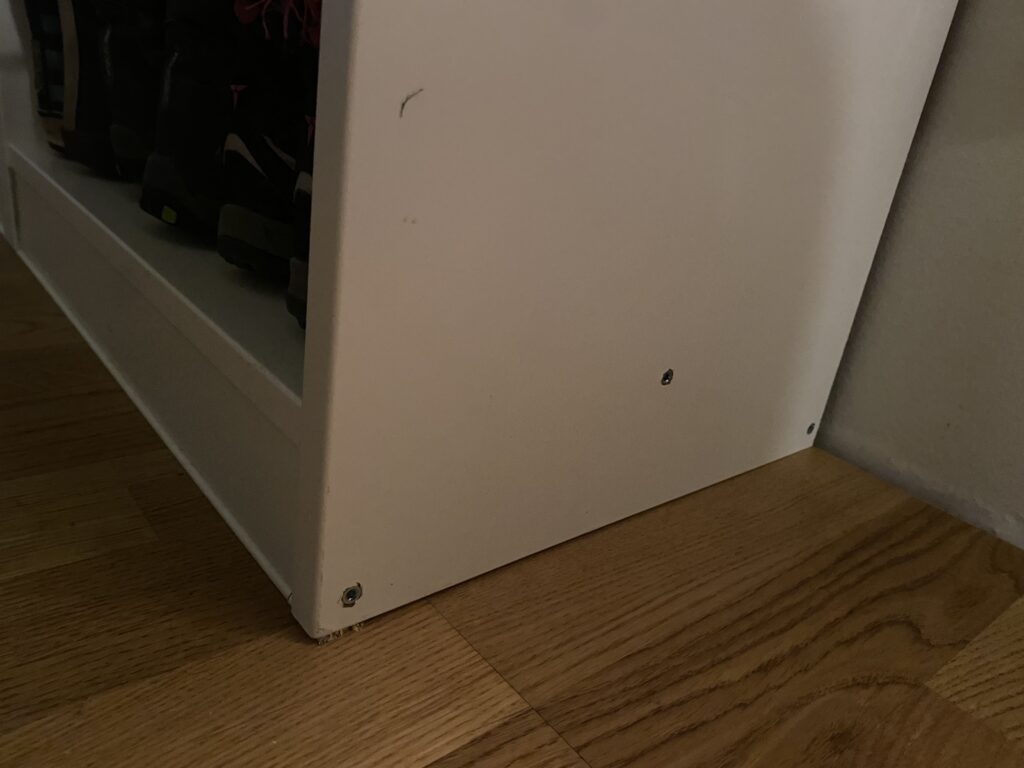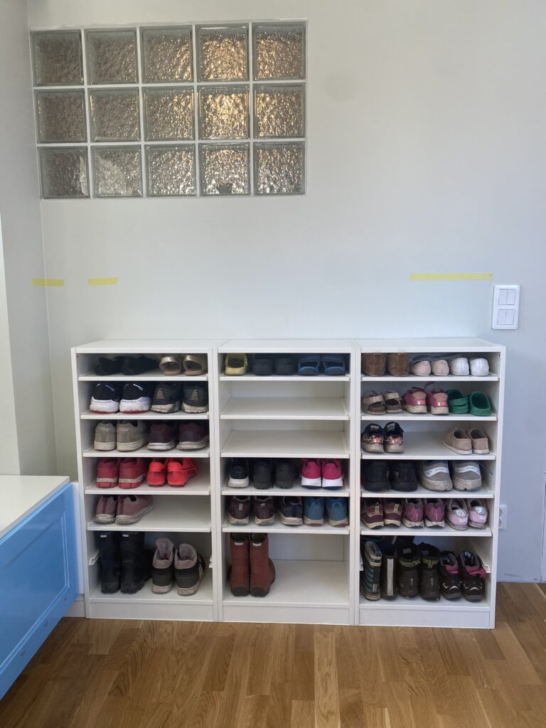 Tre hyllor, så barnen får varsin och vi fyller på med några av våra skor. Hyllplanen är 30 cm djupa vilket längdmässigt funkar ganska exakt för våra vuxenskor. Barnens skor är mindre och därför kan de även ha skor bakom. 39 par skor på bilden ovan och som synes plats för ytterligare fler. Barnen får plats med tre par per hyllplan, även om de större barnen får ha en sko bakom de andra.