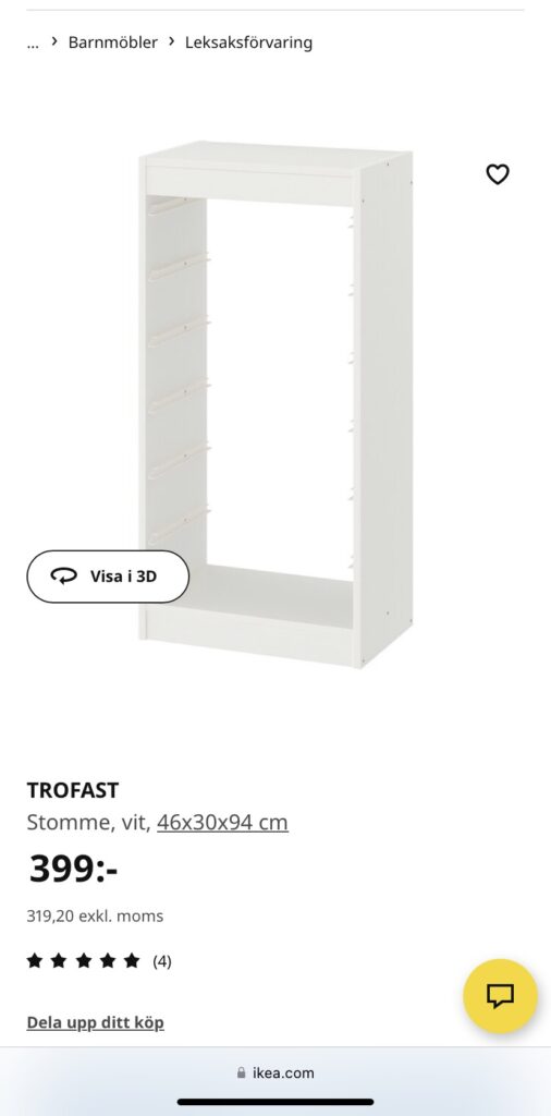 Vi har kollat runt på lite olika skoskåplösningar för att utnyttja väggen optimalt. Den gula tejpen i bilden nedan anger storleken på de skåp vi hade tänkt köpa från början. Men efter att helt varit inne på att det var skoskåp som gällde kom Johan på idén med att köpa IKEAs Trofast-hyllor. Mycket billigare än skoskåp (dessutom rabatt på Trofast när vi handlade). Vi får även plats med fler skor. Och vi kom också fram till att det kanske inte är så dumt att se skorna ändå – lättare att få överblick över vilka skor vi har och att hitta rätt.