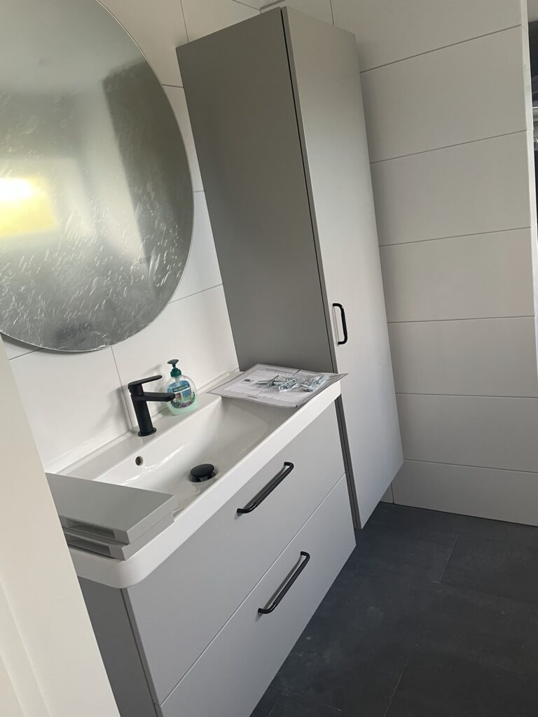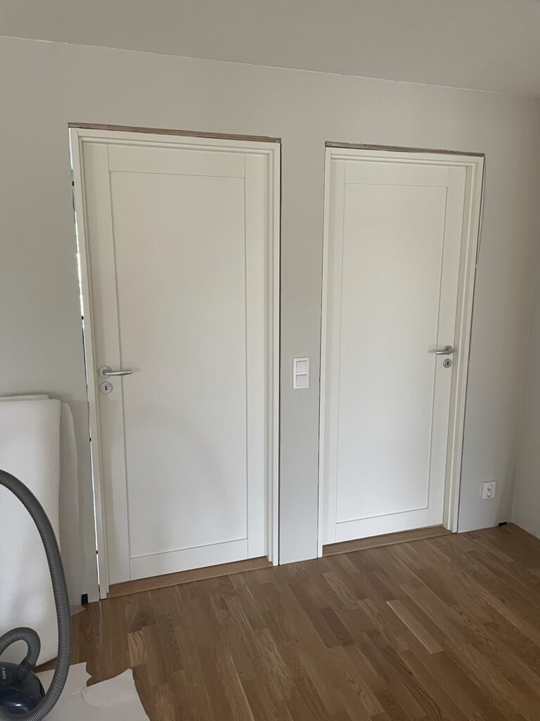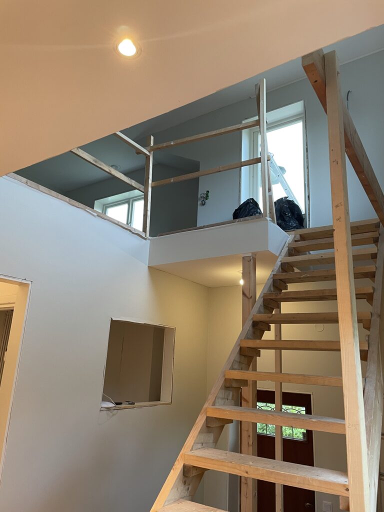 Det är just nu en hel del småfixande. Dels kom rörmokaren förbi och fixade bla termostaterna som inte funkade som de skulle. Snickaren satte dörrar, taklister i trapphuset, öppnade upp kring trappen och satte handtag på badrumsskåpen mm.