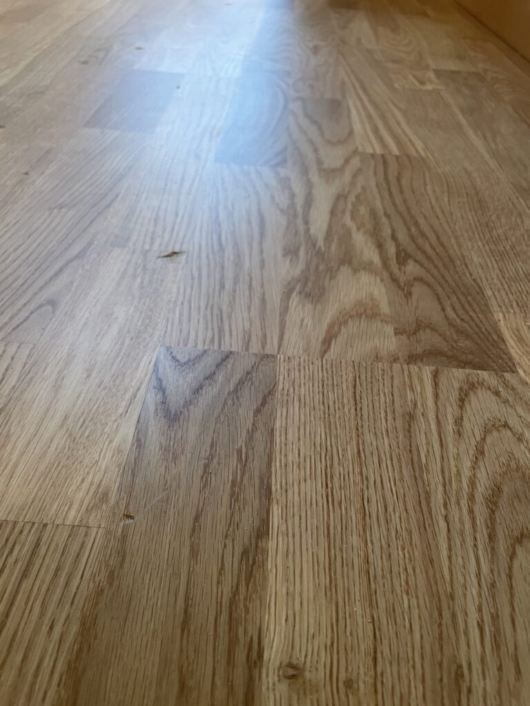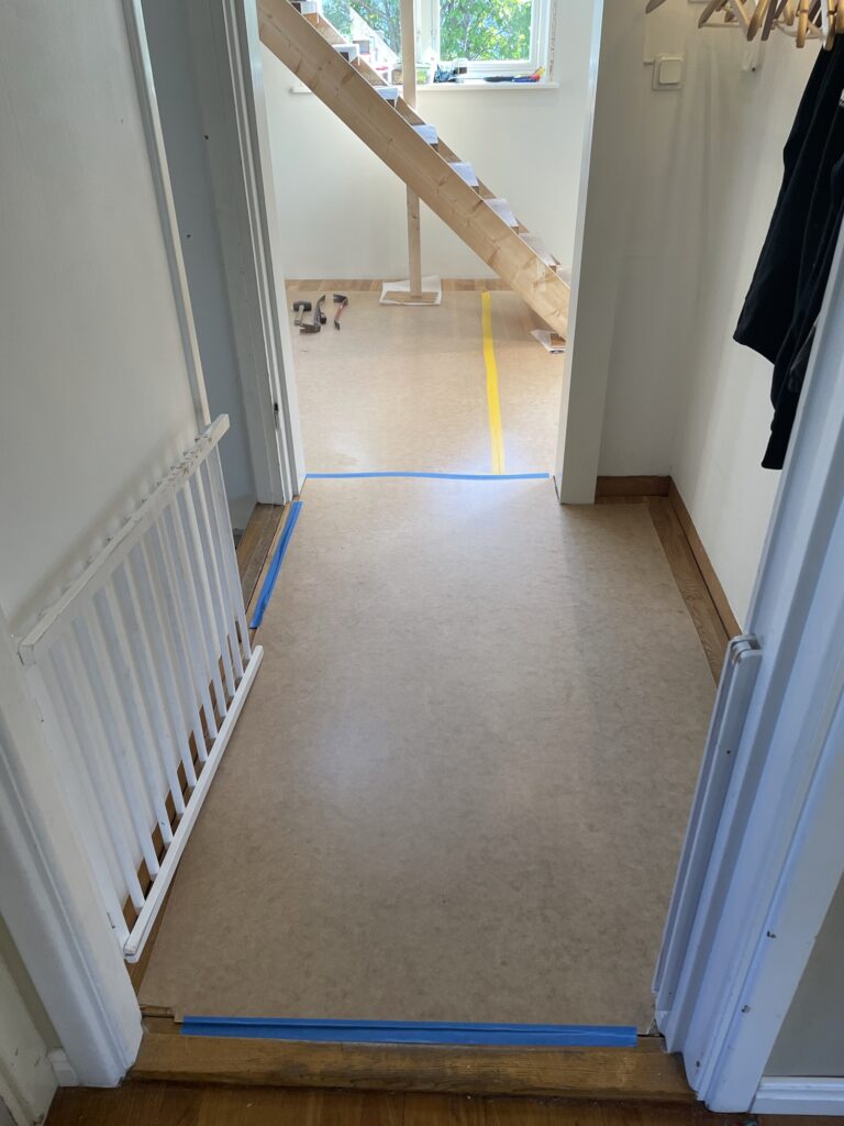 Vi upptäckte ett stort jack i hallgolvet. Vi kom sedan fram till att det var Lisa som tappat vår dator när hon klättrat över grinden. Så imorse fixade snickaren en ny golvbräda och lade sedan på masonitskivor för att skydda vårt nya fina golv. Kanske ska låta det ligga kvar tills barnen vuxit upp..?