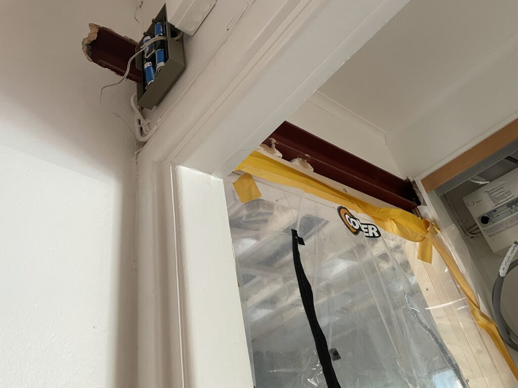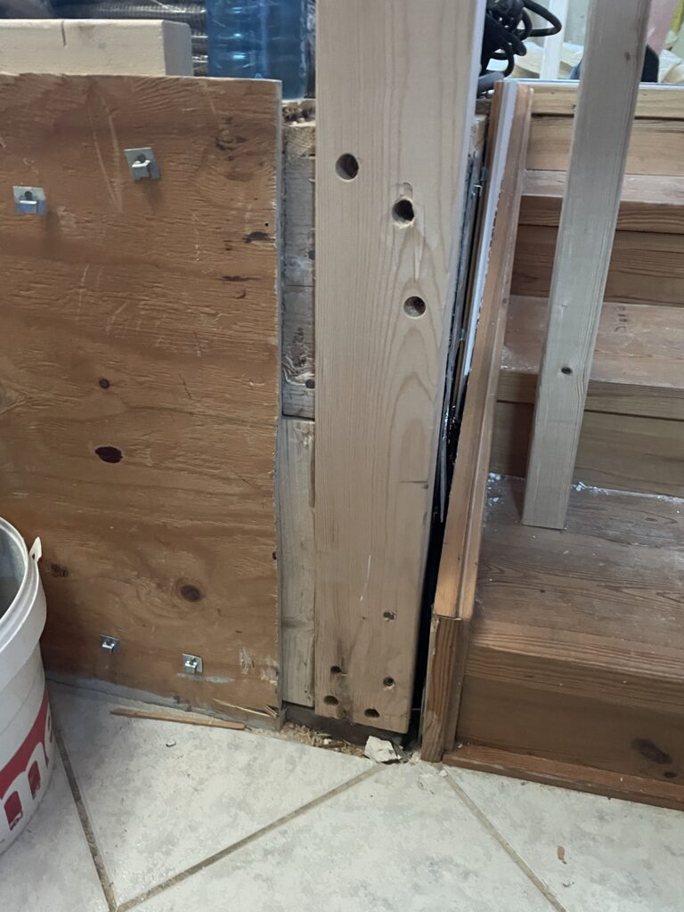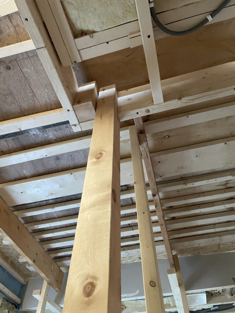 I hallen har de, som det skrivits om tidigare, satt fast pelaren upp till plattformen ovan.