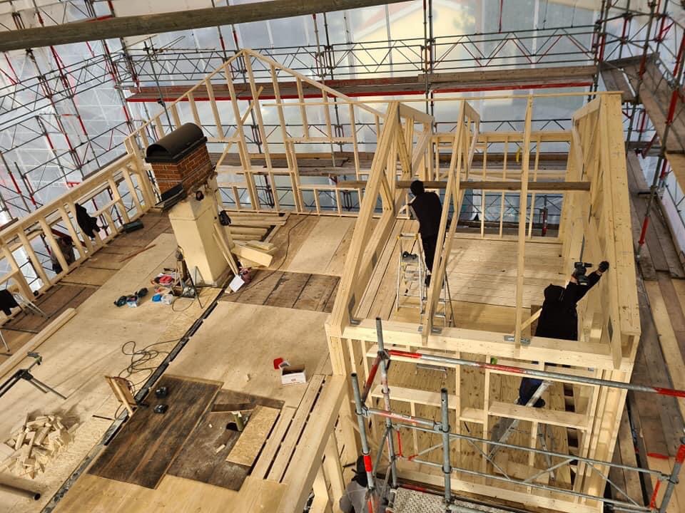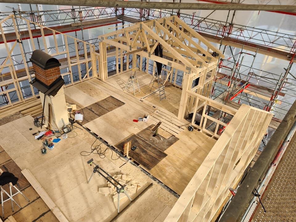 Vi är själva inte på plats men lånar byggarens bilder från idag. De mindre takstolarna ovanför trapp och badrum har de fått upp på egen hand. Senare i veckan kommer det en kranbil.