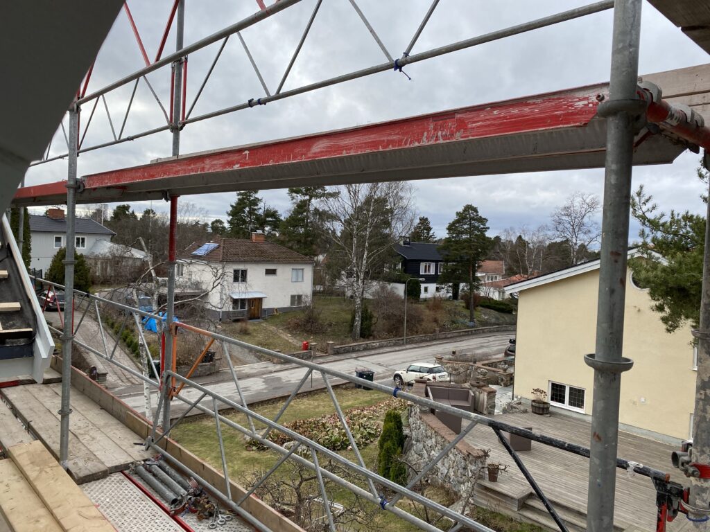 Tog ett varv uppe på byggnadsställningarna på eftermiddagen. Väderskyddet skyddar inte precis från att trilla ner men det kändes ändå tryggare att ha det kring sig när man är där högt uppe.