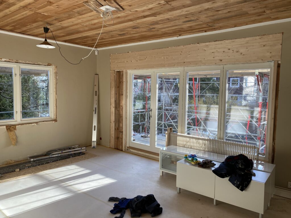Att väderskyddet är borta gör inte bara att vi kan se hur huset ser ut utifrån (även om det fortfarande är lite svårt att se slutresultatet då det saknas lite foder mm + att det är massa byggnadsställningar i vägen) utan också att vi kan se ut. Vilken skillnad det gör att slippa titta in i den vita plasten! Skönt att det var två ganska trista månader vi fick göra det och att vi kan se ut igen nu när det börjar bli vår.