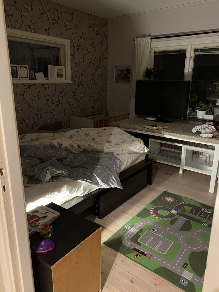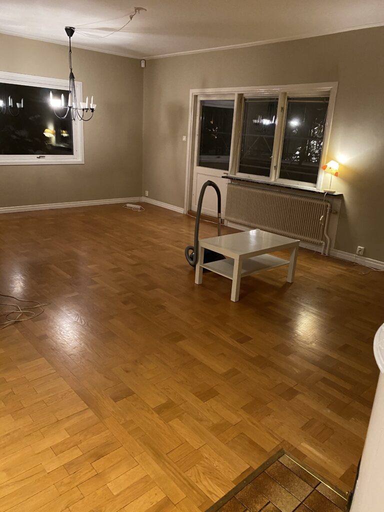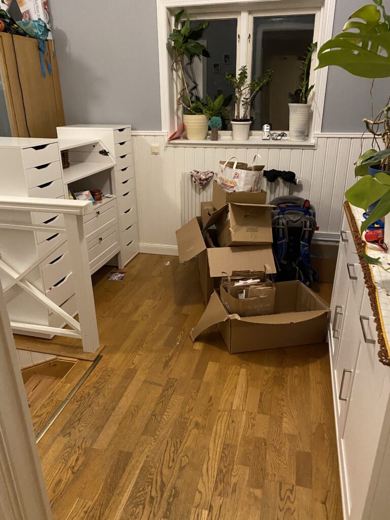 Imorgon drar det igång på riktigt. Vi ska öppna upp mellan kök och barnens rum (som ska bli matplats) men annars behåller vi entréplan i princip som det är. Då behöver vi inte förbereda så mycket på den våningen tänkte jag lite naivt. Men för att klara att hålla upp ett nytt våningsplan behövs balkar och pelare som ska in i väggen så idag har vi tömt hela vardagsrummet. Matsalsbord, tevebänk och TV hamnade i sovrummet. Soffan i barnens rum, och skötbord och skänk flyttades ut i hallen.