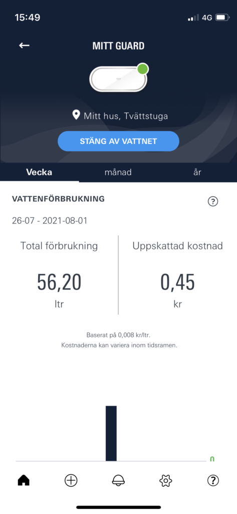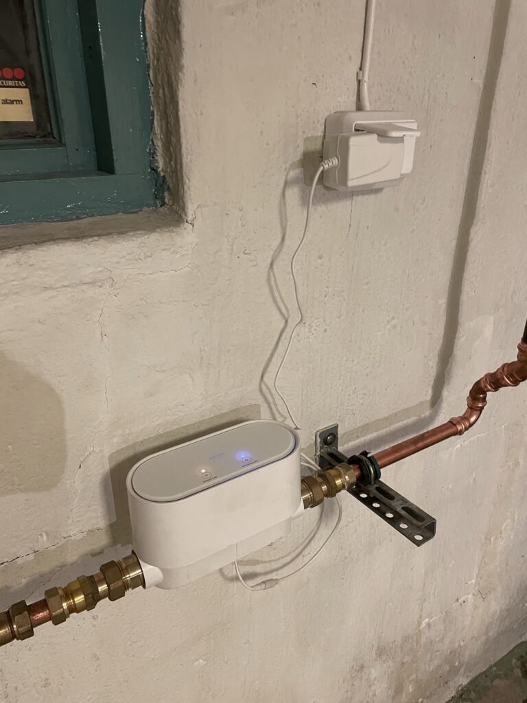 När vi gjorde inkommande vatten i början på året köpte vi en vattenfelsbrytare att koppla på inkommande vatten. Det hanns dock inte med då så vi har väntat länge på att installera den. Och nu är den på plats. Den har två syften. Dels att kunna stänga av vattnet på kommando, tex när vi är bortresta eller per automatik om den upptäcker vattenläckage och dels att mäta och visualisera vattenförbrukningen i huset för att bli mer medvetna om hur mkt vatten vi förbrukar. Vatten är billigt i Stockholm så rent ekonomiskt är det inte i dagsläget jätteintressant, men känns ändå bra att bli mer medveten om husets förbrukning. Efter en del efterforskning landade det i en Grohe Sense Guard som jag tror passar bra in med vårt övriga smarta sortiment här hemma. Till den följde också tre sensorer för att upptäcka vattenläcka, tex under diskmaskin, ismaskinen, vattenavrinningen från fördelarskåp mm. Men enheten i sig ska vara smart nog att förstå om nåt står och droppar någonstans när det inte borde.