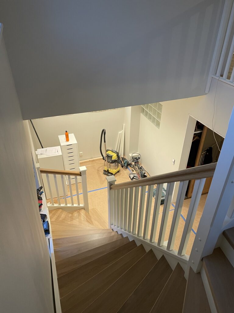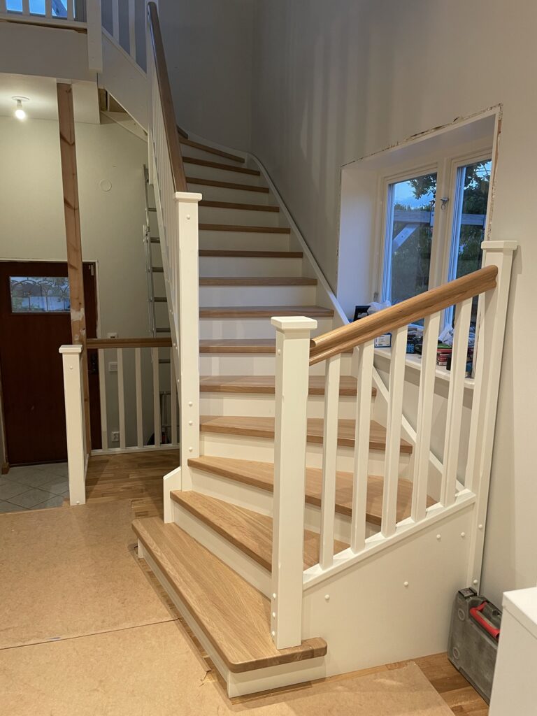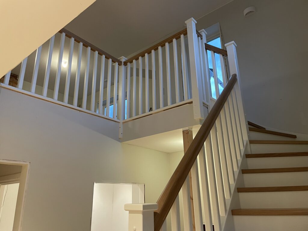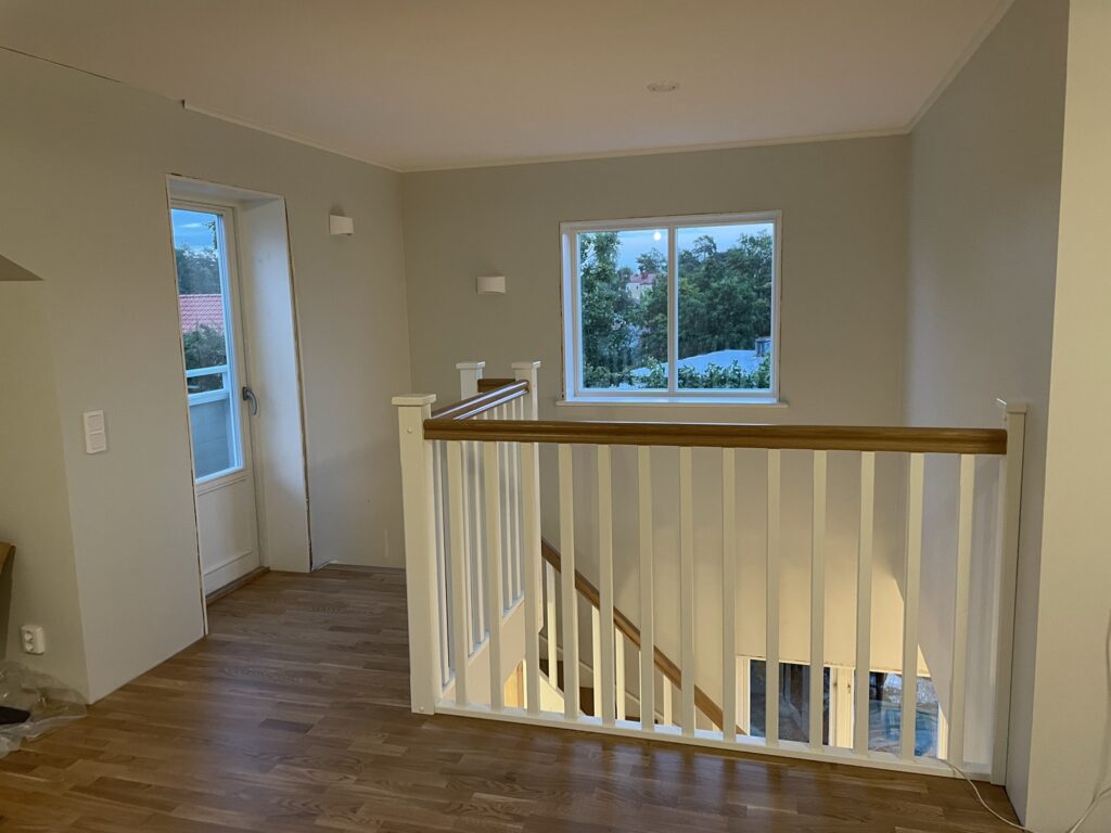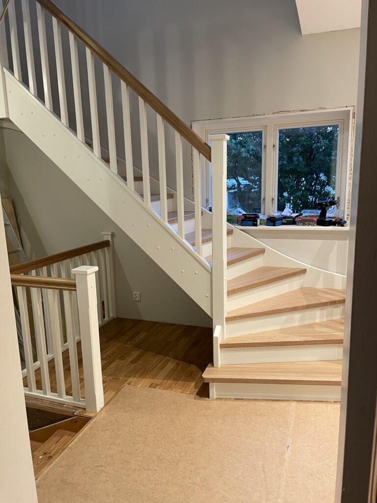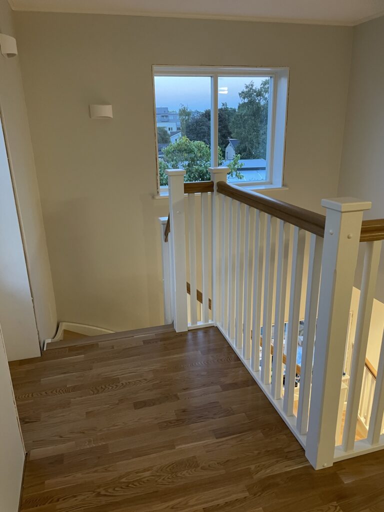 Snickarna fick idag upp räcken och räckesstolpar så idag fick hela familjen provgå trappan. Två räcken utmed väggen kvarstår samt lite list men annars är den klar! Nylackad trappa gör den lite hal men annars är den väldigt trevlig att gå i. En trappa blir ju en väsentlig del av huset som ska knyta ihop våningarna så det känns riktigt bra att ha fått den på plats. Och fin blev den också!