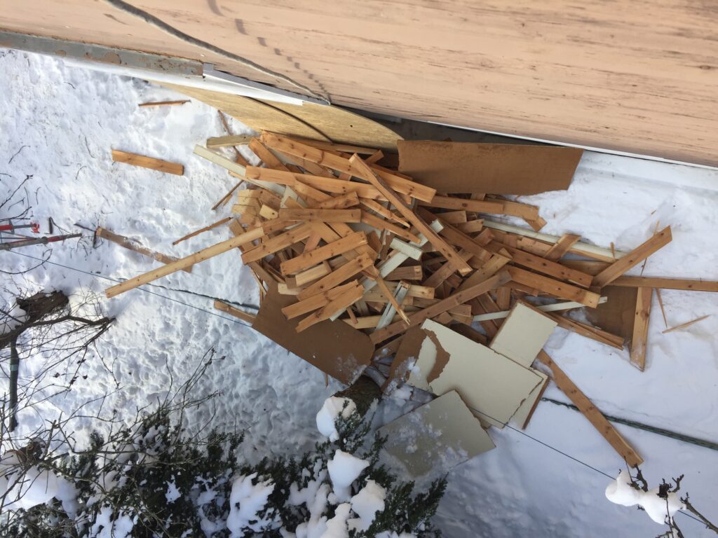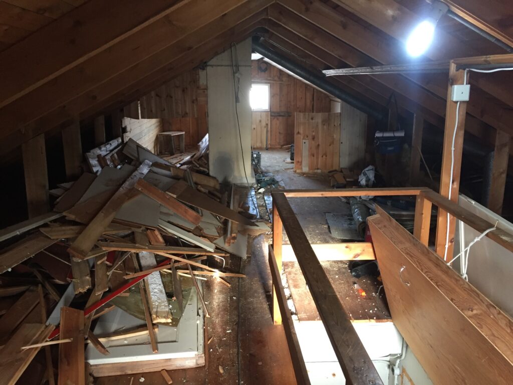Snickarna lade plywoodskivor framför källarfönstren för att skydda dem och städade ur vinden ordentligt.
