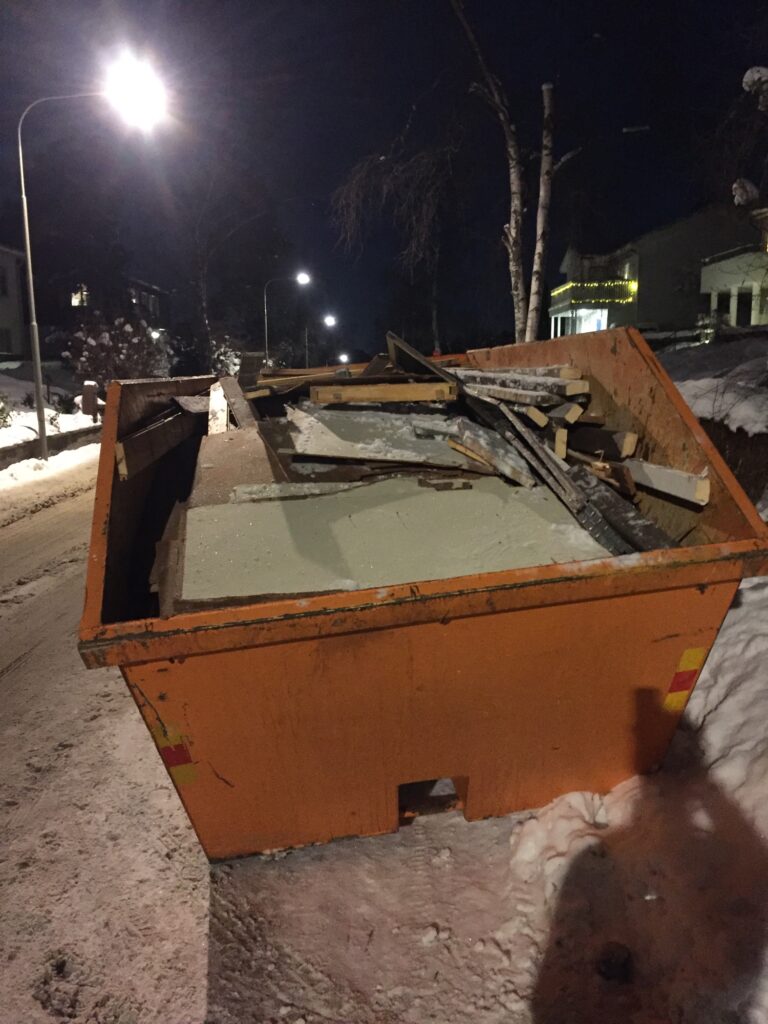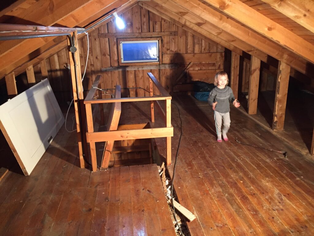 Nu är all kattvind, alla garderober och det lilla rum som var inklätt borttaget. Allt åkte ut genom vindsfönsteret och förflyttades till vår första container. Linnéa fick en promenad med mormor så jag kunde hjälpa till med slit och släng.